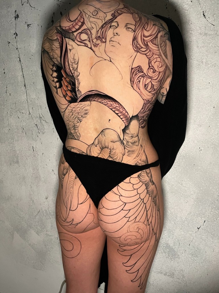 I am starting off with a full front that I finished on Lara. Her sleeve (which also has a snake) is made by me too! It was an older tattoo, and she came back after a while to get something even bigger and more painful. It took us 1 year to finish this project! Thank you so much again for the good talks, the good company, and all the flowers you brought me 🙂