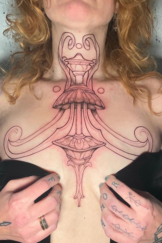 Now I am going to show you the first session of this chest piece that I’ve been working on for Kelly! She plans to extend this significantly across her entire chest and ribs too! I can’t wait to show you guys how this one develops over time. I’ve been wanting to create some floral/ornamental tattoos for a while, and Kelly found me at the right moment.